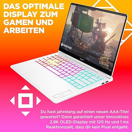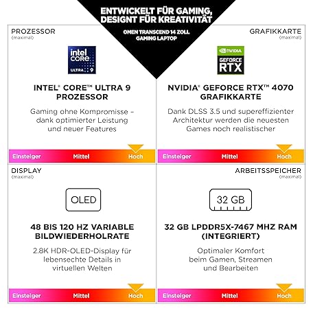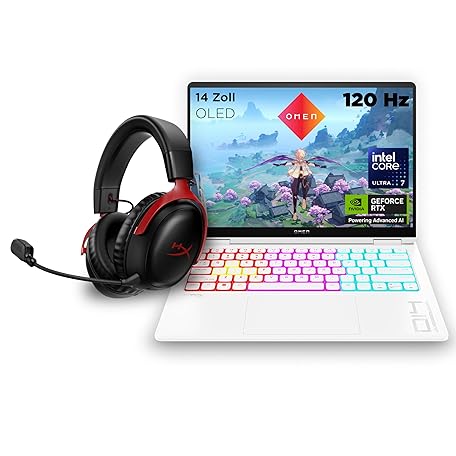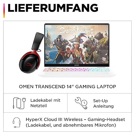 Thông tin sản phẩm HP OMEN Transcend Gaming Laptop, 14 Zoll 2,8K OLED 120Hz, Intel Core Ultra 7 155H, 16 GB DDR5 RAM, 1 TB SSD, NVIDIA GeForce RTX 4060 (8GB), QWERTZ, Windows 11, Weiß inkl. HyperX Cloud III Wireless