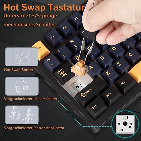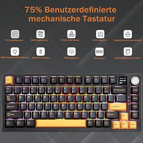 Thông tin sản phẩm HUO JI CQ082 Kabellose Gaming Tastatur, QWERTY,BT/2.4G/USB-C 75 Prozent RGB Mechanische Tastatur, Farbbildschirm, Gasket-Struktur, Hot-Swap-fähig, Vorgeölte Lineare Switches, Softwareunterstützung