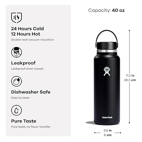 Thông tin sản phẩm Hydro Flask 1,180 ml Drinking Bottle, Insulated Stainless Steel Drinking Bottle, Sports Bottle with Leakproof Flex Cap Lid and Strap, Thermal Flask, Dishwasher Safe, Large Opening, Black