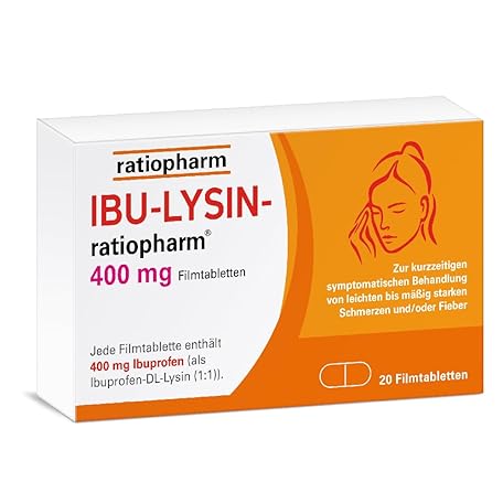 Sản phẩm IBU-LYSIN-ratiopharm 400 mg film-coated tablets: the quick help against pain. Pain reliever with the active ingredient ibuprofen lysine, pack of 20 đang được bán với giá ưu đãi là $11.8483 tại nước Đức.