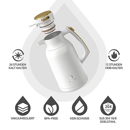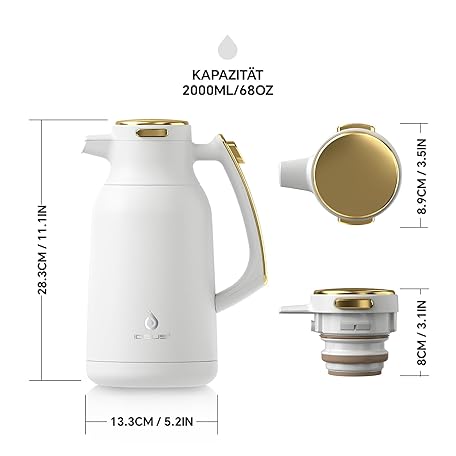Thông tin sản phẩm IDEUS Thermos Flask, 2 L, Stainless Steel Double-Walled Coffee Pot, Vacuum Insulation, Insulated Jug, Warming Jug, Teapot for Coffee, BPA-Free, White & Gold