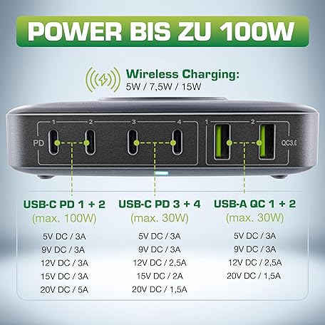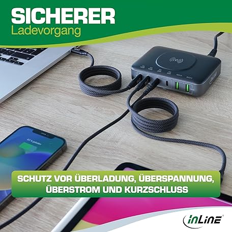 Sản phẩm InLine Qi Powerstation 6-Port, Wireless Charger, 4x USB-C, 2x USB-A, GaN, 100W, Schnellladegerät, Netzteil für MacBook Pro/Air, iPhone/Pro/mini, iPad Pro, Pixel und mehr, schwarz, 31517K đang được bán với giá ưu đãi là $82.1642 tại nước Đức.