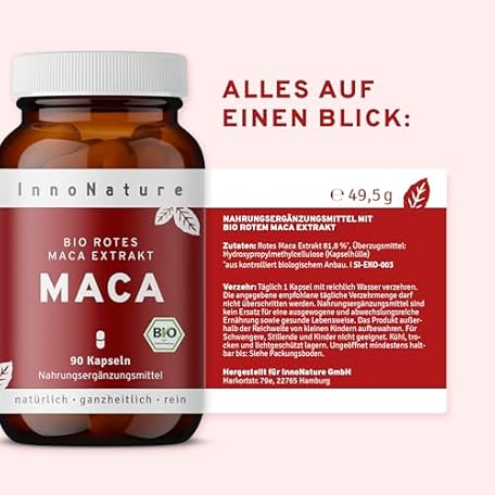 InnoNature Organic Red Maca Extract Capsules, Red Maca Made from Pure Natural Ingredients, 90 Capsules, 450 mg Extract per Capsule, Gluten-Free, Vegan, No Additives