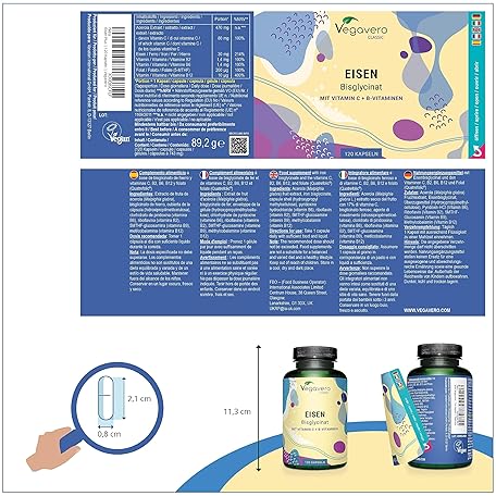 Thông tin sản phẩm Iron Bisglycinate Vegavero®, 30 mg iron, with natural vitamin C, folic acid Quatrefolic®, vitamin B12, B6 & B2, vegan and without additives, 120 capsules