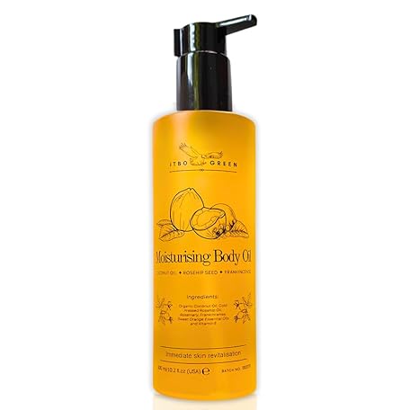 ITBO Green Natural Moisturizing Body Oil | Kokosöl mit Hagebuttensamen, Weihrauch und Vitamin E | Massageöl | 100% pflanzlich | Intensive Pflege für Haut & Haar | 300 ml