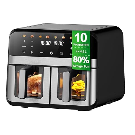 • Jacgood 9L XXL Doppelkammer Heißluftfritteuse mit 2 Körben, 8 Programmen & Smart Finish – Dual Zone Airfryer, Touchscreen, Timer, fettarm & ölfrei