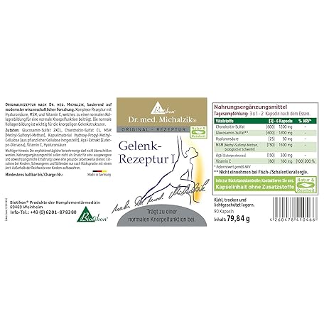 Thông tin sản phẩm Joint Formula I Dr. Michalzik - 90 Capsules - with Hyaluronic Acid, MSM, Chondroitin Sulphate, Açaí Extract, Glucosamine Sulphate and Vitamin C - No Additives - from BIOTIKON®