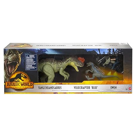 Thông tin sản phẩm Jurassic World HLP79 Dominion 3 Pack Figures & Dinosaurs, Owen Grady Motorcycle Yangchuanosaurus & Blue, Helmet & Tranquilizer, Dinosaur Toy for Children from 4 Years