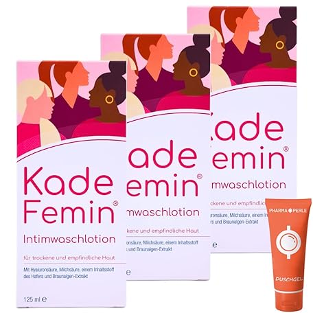 KadeFemin Intimwaschlotion 3x 125 ml I Sanfte Intimpflege für trockene & sensible Haut I Mit Hyaluronsäure & Milchsäure I pH-hautneutral, vegan & duftstofffrei I Spar-Set plus Pharma Perle give-away