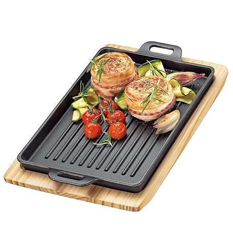 Küchenprofi BBQ Grill Pan Cast Iron Grooved on Wooden Board, Square, 32 x 22 x 3.5 cm, Fire Pit, All Hob Types Including Induction, Serving Pan 0305351026