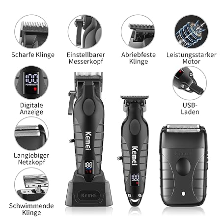 Thương hiệu KEMEI là cái tên nổi tiếng được rất nhiều khách hàng trên thế giới chọn lựa. Với kiểu dáng đẹp mắt, sang trọng, sản phẩm KEMEI Professional Barber Hair Trimmer Set for Men, Wireless Electric T-Blades Hair Trimmer Foil Shaver Kit, USB Rechargeable Hairdresser Hair Cutting Machine Set with 9 Guide Combs là sự lựa chọn hoàn hảo nếu bạn đang tìm mua một món cho riêng mình.
