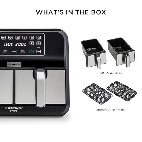 Sản phẩm Kenwood kHealthy Fry Twin Airfryer HFM20,000MB, 8L (2x4L), Double Chamber, 8 Programmes, Dual Cook & Sync Finish Function, Touch Display, Non-Stick, 200 Degrees, Timer (up to 60 Minutes) & 24 Hours đang được bán với giá ưu đãi là $134.7349 tại nước Đức.