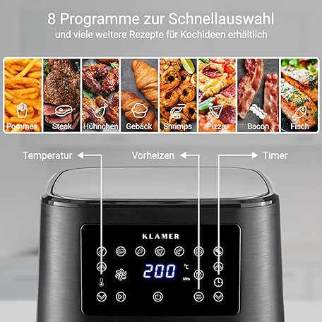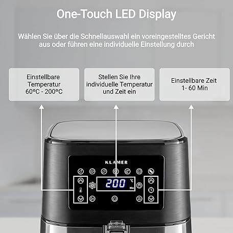 Thông tin sản phẩm KLAMER Hot Air Fryer 5.5 L XXL, Oil-Free Fryer, 1700 W Airfryer with LED Touch Screen, Digital German Recipe Book, Multifunctional Mini Hot Air Fryer without Oil
