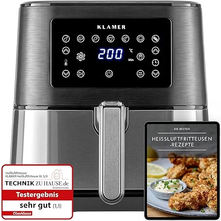 Sản phẩm KLAMER Hot Air Fryer 5.5 L XXL, Oil-Free Fryer, 1700 W Airfryer with LED Touch Screen, Digital German Recipe Book, Multifunctional Mini Hot Air Fryer without Oil đang được bán với giá ưu đãi là $115.6817 tại nước Đức.
