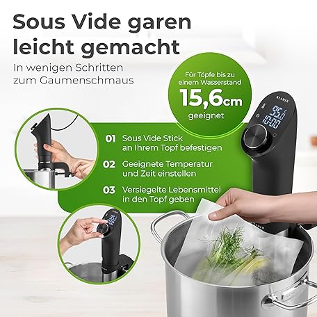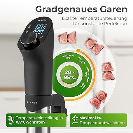 Thông tin sản phẩm KLAMER Sous Vide Stick, 1200 Watt IPX7 Waterproof Sous Vide Cooker with 3D Circulation and 20-95°C Temperature Control, Slow Cooker Timer Function and LED Display