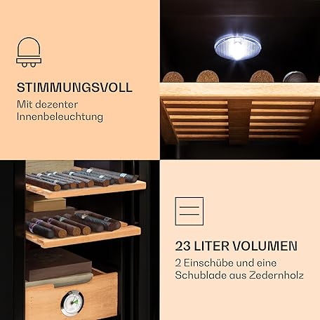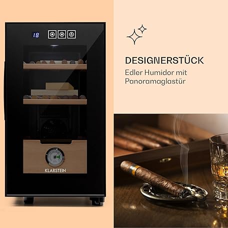 Sản phẩm KLARSTEIN EL Presidente, 48 Cigar Humidor, Thermoelectric, Glass Door, Temperature: 12-23°C, Energy efficiency class: C, LED, glazed door, hygrometer, panoramic load door đang được bán với giá ưu đãi là $169.3206 tại nước Đức.