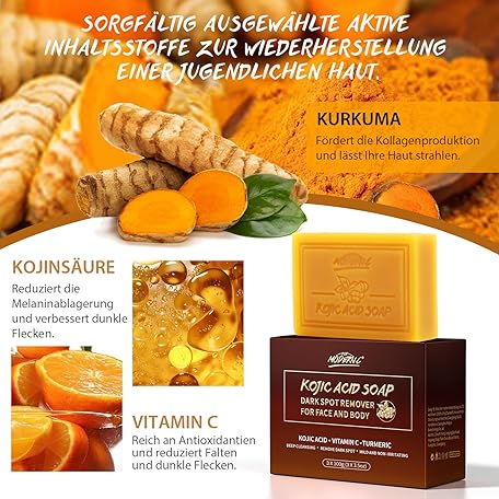 Sản phẩm Kojic Acid Soap with Turmeric and Vitamin C, Stain Remover for Face and Body, 3 x 100g, Moisturising Against Acne and Blackheads, Hyaluronic Acid for Deep Cleansing, with Mesh Bag đang được bán với giá ưu đãi là $15.9794 tại nước Đức.