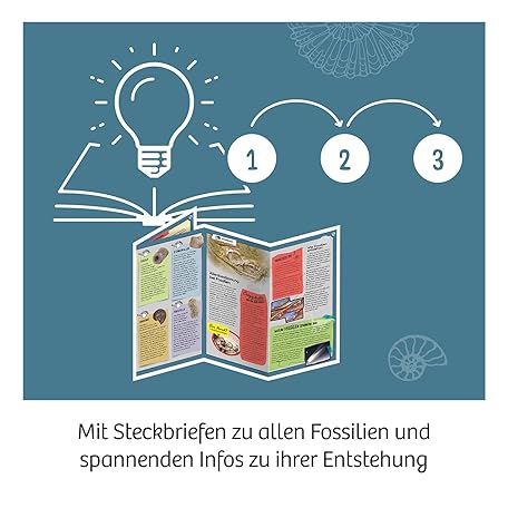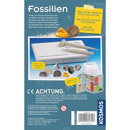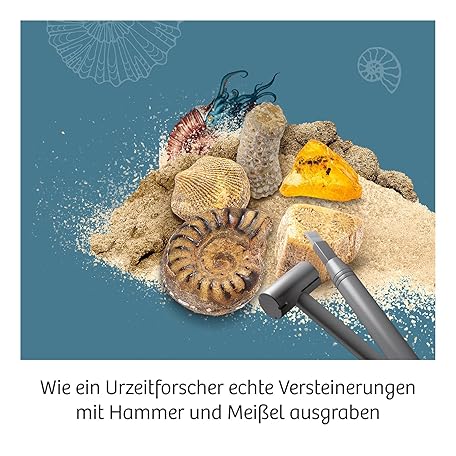 Thông tin sản phẩm KOSMOS 657918 Fossilien Ausgrabungs-Set, Grabe echte Versteinerungen und Bernstein selbst aus, mit Hammer und Meißel, Experimentierset für Kinder ab 7 Jahre