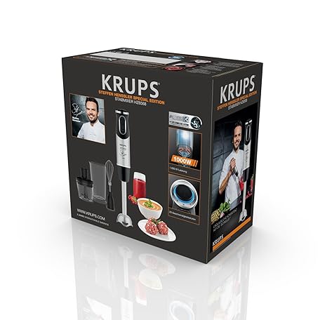 Thông tin sản phẩm Krups HZ656815 Steffen Henssler Special Edition Hand Blender (1000 Watt, Speed Settings: 20, Including: Measuring Cup, Whisk, Crusher, Black/Silver