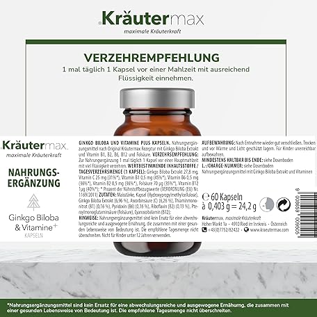 Thông tin sản phẩm Kräutermax Ginkgo Capsules | Ginkgo Biloba Extract with Vitamin C, B1, B2, B6, B12 & Folic Acid According to Kräutermax Original Formula | Produced in Small Series | Ginkgo Extract | 1 x 60 Pieces