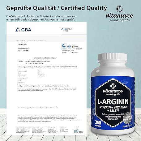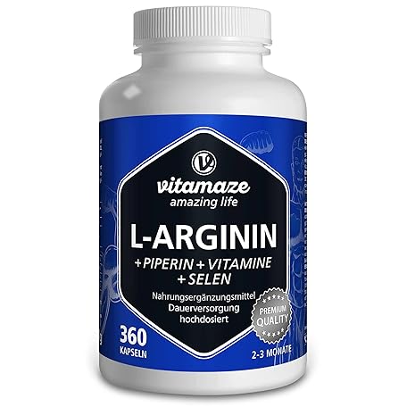 Thương hiệu Vitamaze - amazing life là cái tên nổi tiếng được rất nhiều khách hàng trên thế giới chọn lựa. Với kiểu dáng đẹp mắt, sang trọng, sản phẩm L-arginine capsules high-dose, 360 capsules with VITAL formula B6, B12, folic acid, selenium and piperine for 3 months, pre-workout food supplement without unnecessary additives, Made in Germany là sự lựa chọn hoàn hảo nếu bạn đang tìm mua một món cho riêng mình.