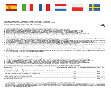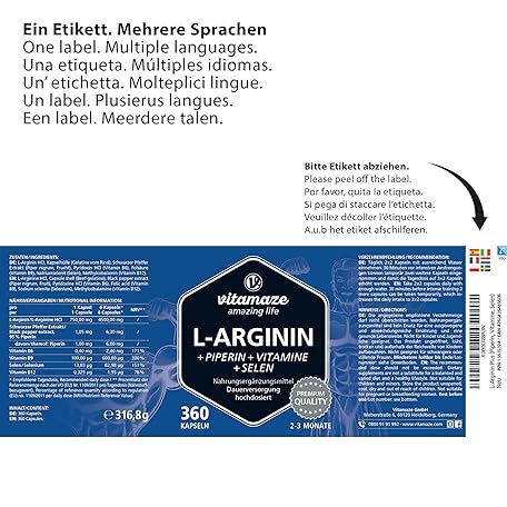 Thông tin sản phẩm L-arginine capsules high-dose, 360 capsules with VITAL formula B6, B12, folic acid, selenium and piperine for 3 months, pre-workout food supplement without unnecessary additives, Made in Germany
