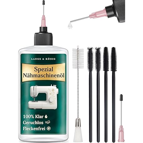 Lange & König 100 ml Nähmaschinenöl Pflege Set - Klar, Geruchlos, Nicht fleckend Inkl. 2x Präzisions-Dosierspitzen (25mm & 38mm) + 5 Reinigungsbürsten - Nähmaschine Zubehör Nähzubehör für Nähmaschine