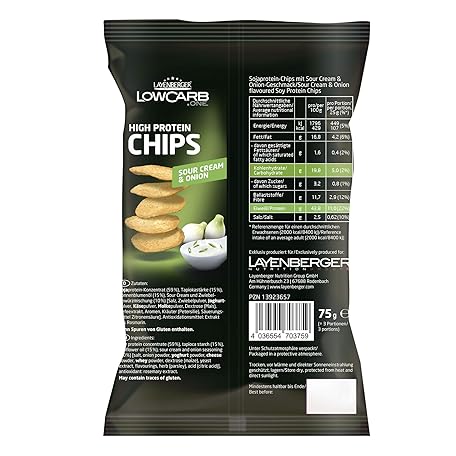Thông tin sản phẩm Layenberger High Protein Chips Sour Cream & Onion (1 x 75 g) & High Protein Chips Paprika, Rich 43.1% Protein and Only 21.2% Carbohydrates with Only 2.3 g Sugar, Not Fried, (1 x 75 g)
