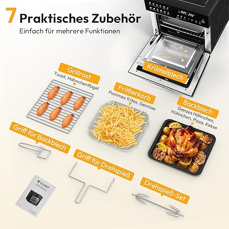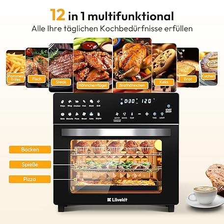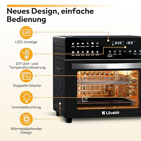 Thông tin sản phẩm LLIVEKIT Hot Air Fryer Mini Oven 26 L, 1700 W Airfryer XXL with 12 Programmes and Recipe Book, Hot Air Oven with Digital LED Display, Fryer with Preheating, Keeping Warm & Warming Up