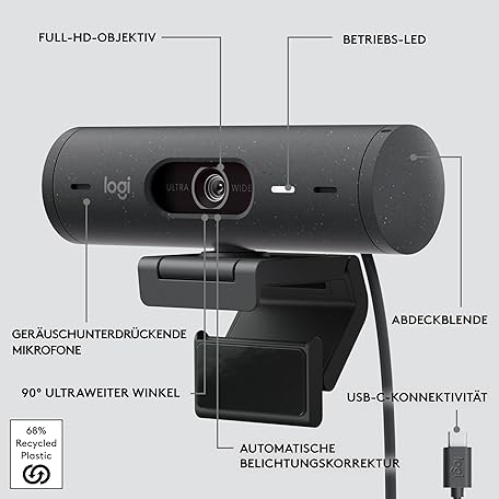 Sản phẩm Logitech Brio 500 Full HD Webcam with Auto Light Correction, Point Mode, Dual Microphone + Noise Cancellation Webcam Cover for Microsoft Teams, Google Meet, Zoom, USB-C Cable - Graphite đang được bán với giá ưu đãi là $96.1053 tại nước Đức.