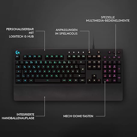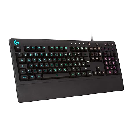 Sản phẩm Logitech G213 Gaming Keyboard Prodigy, RGB lighting, programmable G-keys, multimedia controls, integrated palm rest, splashproof, German QWERTZ layout, Black đang được bán với giá ưu đãi là $57.1596 tại nước Đức.