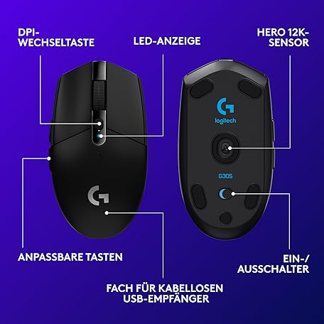 Thông tin sản phẩm Logitech G305 LIGHT SPEED wireless gaming mouse, HERO 12000 DPI sensor, 6 programmable keys 250 hours of battery life, Customizable game profiles, lightweight, PC / Mac, Black - German Packaging