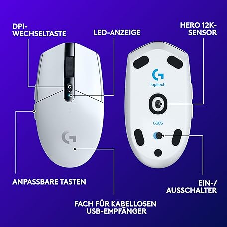 Thông tin sản phẩm Logitech G305 LIGHT SPEED wireless gaming mouse, HERO 12000 DPI sensor, 6 programmable keys 250 hours of battery life, Customizable game profiles, lightweight, PC / Mac, white - German Packaging