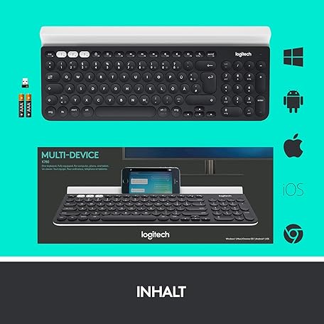 Thông tin sản phẩm Logitech K780 Wireless Keyboard, Bluetooth & 2.4 GHz connection, Multi Device & Easy-Switch feature Integrated holder, PC / Mac / Tablet / Smartphone, German QWERTZ layout - Dark Gray / White