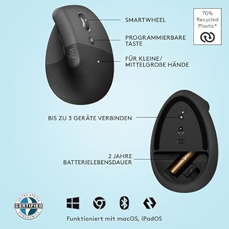 Sản phẩm Logitech Lift Vertical Ergonomic Mouse, Wireless, Bluetooth or Logi Bolt USB Receiver, Quiet Clicks, 4 Buttons, Compatible with Windows/macOS/iPadOS, Laptop, PC - Grаphit đang được bán với giá ưu đãi là $57.1269 tại nước Đức.