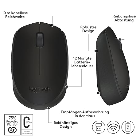Sản phẩm Logitech M171 Wireless Mouse, 2.4 GHz connection via USB receiver, optical sensor, 12-month battery life, for ambidextrous, 3 buttons, PC / Mac - Black đang được bán với giá ưu đãi là $10.7583 tại nước Đức.