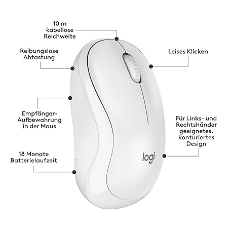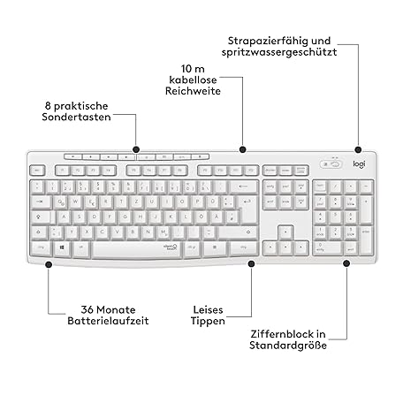 Thông tin sản phẩm Logitech MK295 wireless keyboard mouse set with Silent Touch technology, shortcut buttons, optical tracking, nano USB receiver, delay-free wireless connection, QWERTZ layout-White