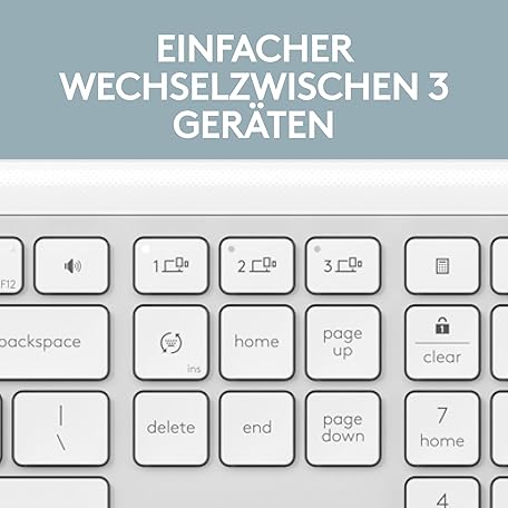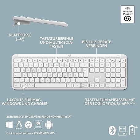 Thông tin sản phẩm Logitech MK950 Signature Slim Wireless Keyboard Mouse Set, Slim Design, Quiet Typing, Switching Between Three Devices, Bluetooth, Multiple Operating Systems, Windows and Mac, DEU QWERTZ Layout, White
