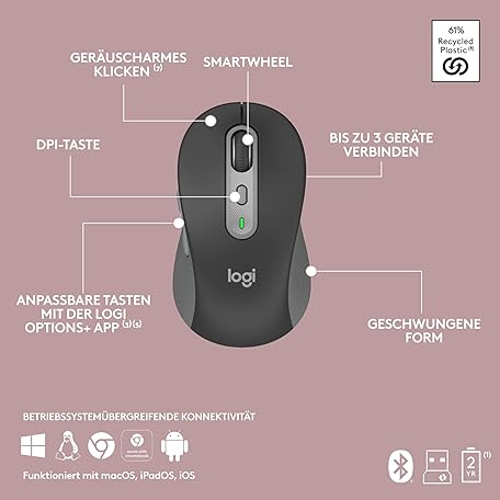 Thông tin sản phẩm Logitech MK950 Signature Slim Wireless Keyboard Mouse Set, Slim Design, Quiet Typing, Switching Between Three Devices, Bluetooth, Multiple Operating Systems, Windows, Mac, DEU QWERTZ Layout, Graphite