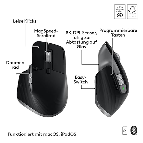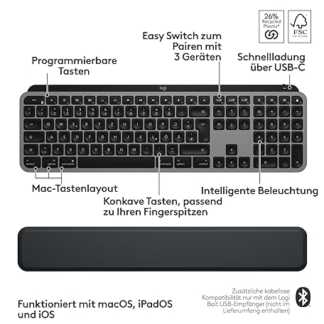 Thương hiệu Logitech là cái tên nổi tiếng được rất nhiều khách hàng trên thế giới chọn lựa. Với kiểu dáng đẹp mắt, sang trọng, sản phẩm Logitech MX Keys S Combo for Mac, kabellose Tastatur/Maus mit Handballenauflage, beleuchtete Tastatur, schnellscrollende Maus, Bluetooth USB C für MacBook Pro/MacBook Air/iMac/iPad, QWERTZ DE - Grau là sự lựa chọn hoàn hảo nếu bạn đang tìm mua một món cho riêng mình.