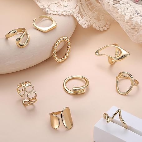 Sản phẩm LOLIAS 9-Piece Gold Rings for Women, Chunky Rings, 18 Carat Gold-Plated Ring Set, Statement Thumb Ring, Domed Thick Open Rings Set for Women, Adjustable đang được bán với giá ưu đãi là $16.5789 tại nước Đức.