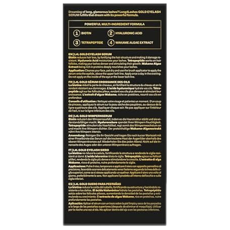 Thông tin sản phẩm Long4Lashes Long4Lashes Gold 4 ml, exclusive eyelash serum, high capacity, superlative serum, increases eyelash growth with a power pack of vegetable ingredients, Superstar formula 4 ml.