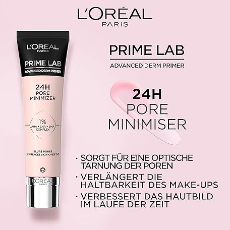 Thông tin sản phẩm L'Oréal Paris Pore Minimizer Primer, Basis für ein langanhaltendes Make-up, sofort kaschierte Unebenheiten und optisch getarnte Poren, Bis zu 24h Halt, Prime Lab Advanced Derm Primer, 30 ml