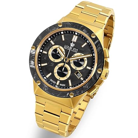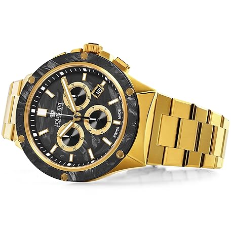 Thông tin sản phẩm LOUIS XVI Le Monarque Men's Watch Chronograph 42 mm Swiss Quartz Movement Stainless Steel Bracelet Gold Dial Black Forged Carbon 1211, gold, Luxury