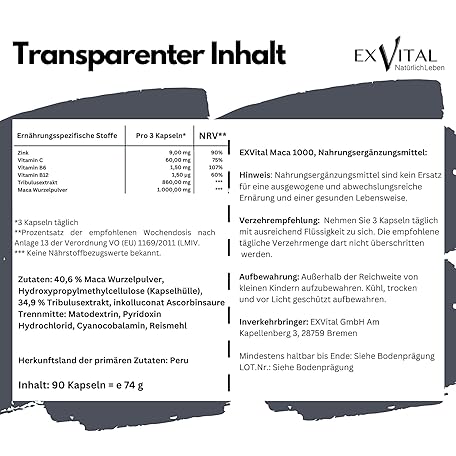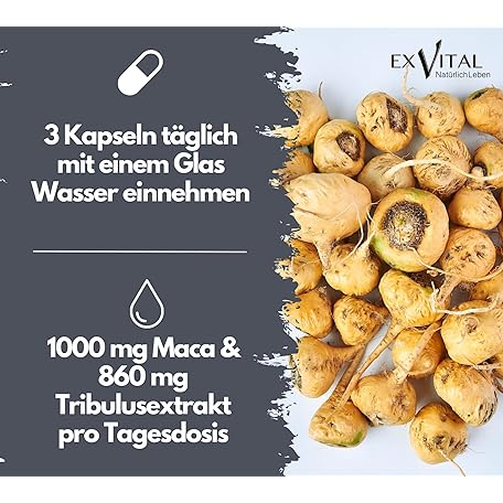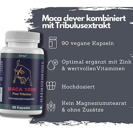 Thương hiệu EXVital là cái tên nổi tiếng được rất nhiều khách hàng trên thế giới chọn lựa. Với kiểu dáng đẹp mắt, sang trọng, sản phẩm Maca 1000 plus Tribulus, Maca und Tribulus ideal kombiniert in einem Produkt, 90 Kapseln in Premiumqualität, Hochdosiert, 1er Pack (1x 74g) là sự lựa chọn hoàn hảo nếu bạn đang tìm mua một món cho riêng mình.