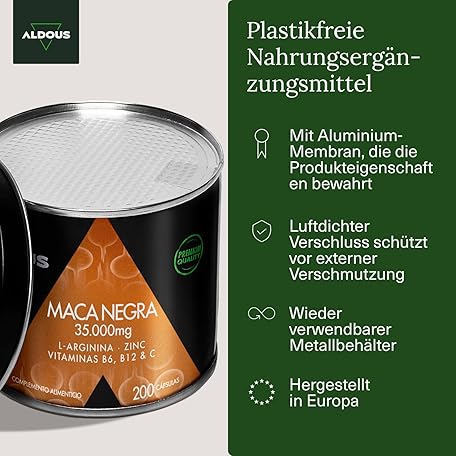 Thương hiệu Aldous Bio là cái tên nổi tiếng được rất nhiều khách hàng trên thế giới chọn lựa. Với kiểu dáng đẹp mắt, sang trọng, sản phẩm Maca Capsules 20:1 High Dose (Black) 35,000 mg per Daily Dose - 200 Capsules with Arginine, Zinc, Vitamin C, B12 and B6 - Energy, Vitality - No Magnesium Stearate and Silicon Dioxide - Plastic-Free là sự lựa chọn hoàn hảo nếu bạn đang tìm mua một món cho riêng mình.