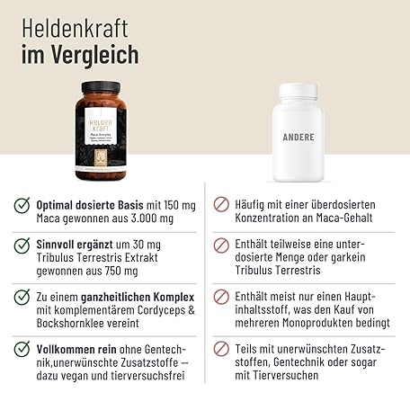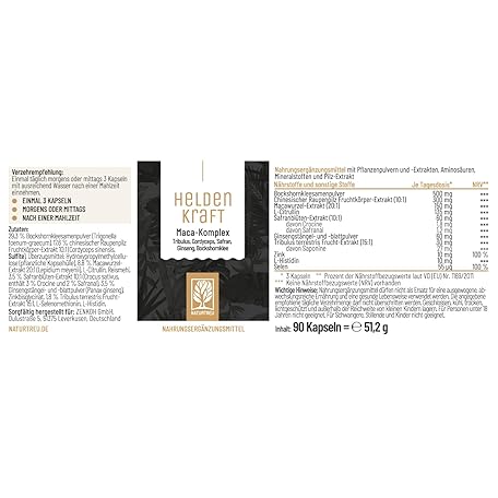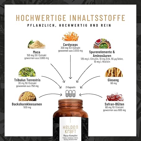 Thông tin sản phẩm Maca Capsules High Dose – Maca 20:1 Extract with Tribulus Terrestris, Cordyceps, Fenugreek, Zinc, Ginseng, Saffron, Selenium – 90 Capsules, Heldenkraft for Men