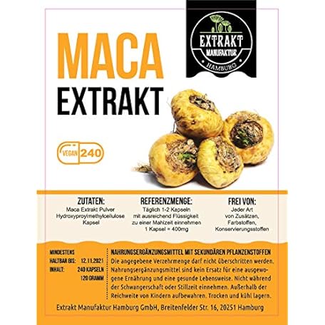 Thông tin sản phẩm Maca Extract, 240 Capsules, 400 mg, Root Extract, Natural, No Additives, High Dose, Vegan & Made in Germany (Capsules 240)