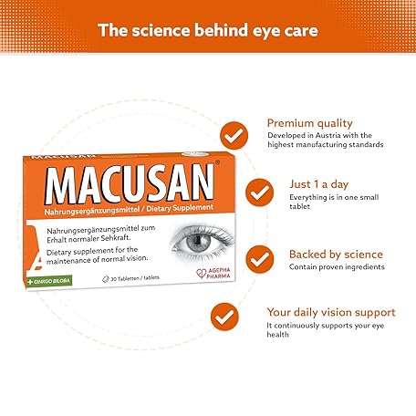 Thương hiệu MACUSAN là cái tên nổi tiếng được rất nhiều khách hàng trên thế giới chọn lựa. Với kiểu dáng đẹp mắt, sang trọng, sản phẩm Macusan® - To maintain normal vision - Ginkgo, Zeaxanthin and Lutein for your eye health - Support against age-related macular degeneration (AMD) (30 tablets) là sự lựa chọn hoàn hảo nếu bạn đang tìm mua một món cho riêng mình.