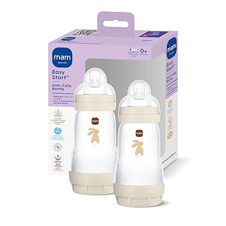 MAM Easy Start Anti-Colic Baby Bottle, 0+ Months, Milk Bottle for Newborns, 94% Acceptance, Less Colic, Breastfeeding-Friendly Baby Drinking Bottle, Teat Size 1, 260 ml, Rabbit, Pack of 2